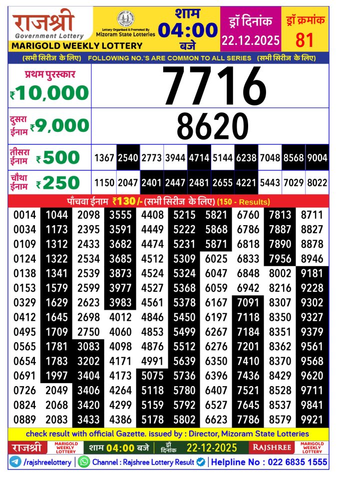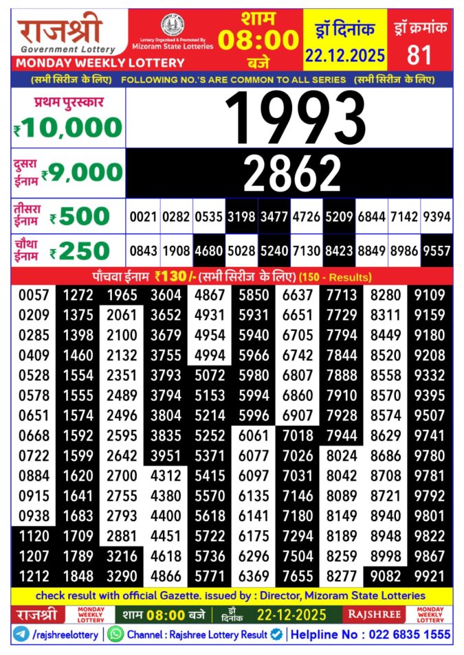 Mizoram Rajshree Lottery Result Today 4PM [22-12-2025]