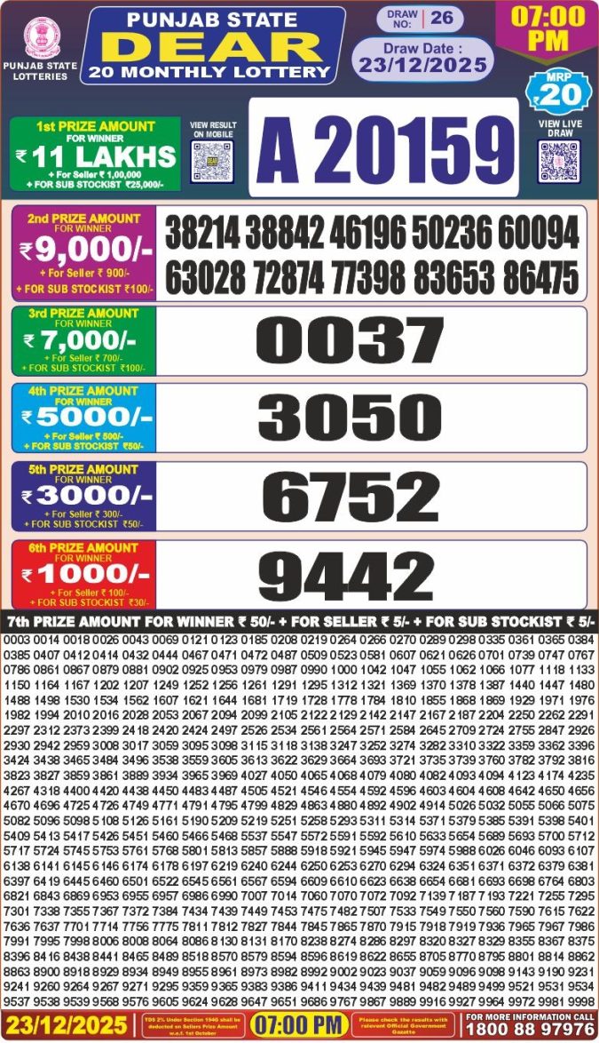 Punjab state dear 20 Monthly Result [23-12-2025] live Draw