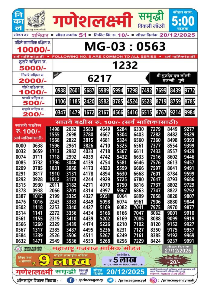 Maharashtra Ganeshlaxmi Lottery Result Today 5PM [20-12-2025]