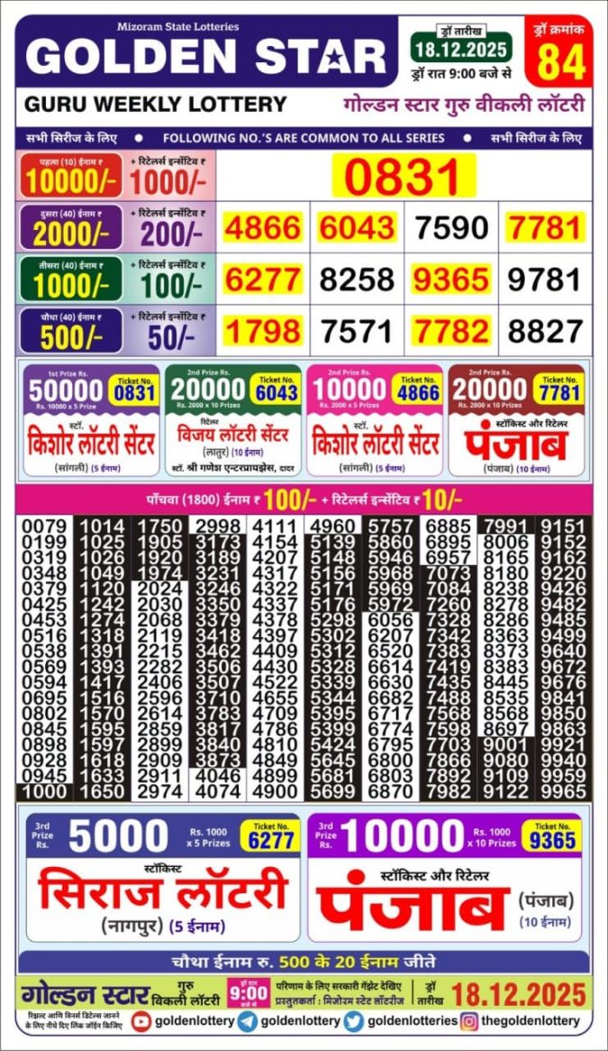 Golden Star Lottery Result Today 9PM [18-12-2025]