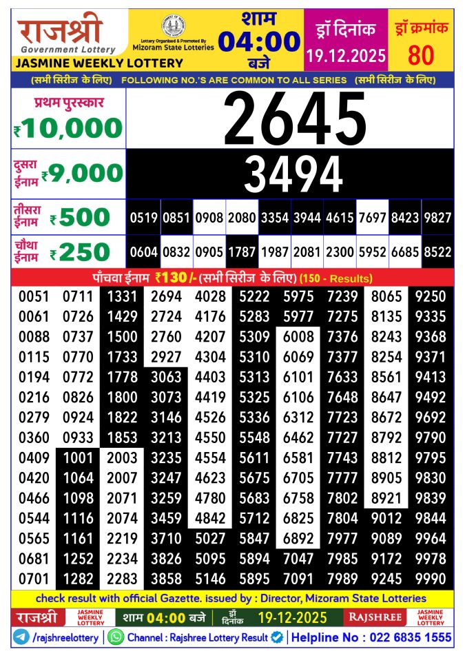 Mizoram Rajshree Lottery Result Today 4PM [19-12-2025]
