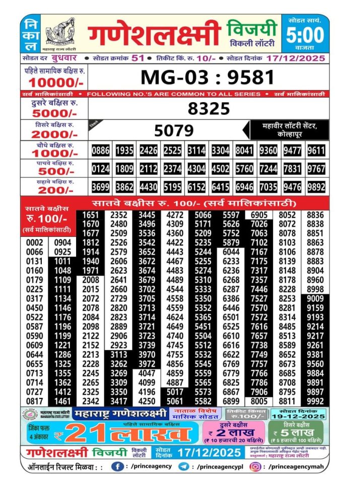 Maharashtra Ganeshlaxmi Lottery Result Today 5PM [17-12-2025]