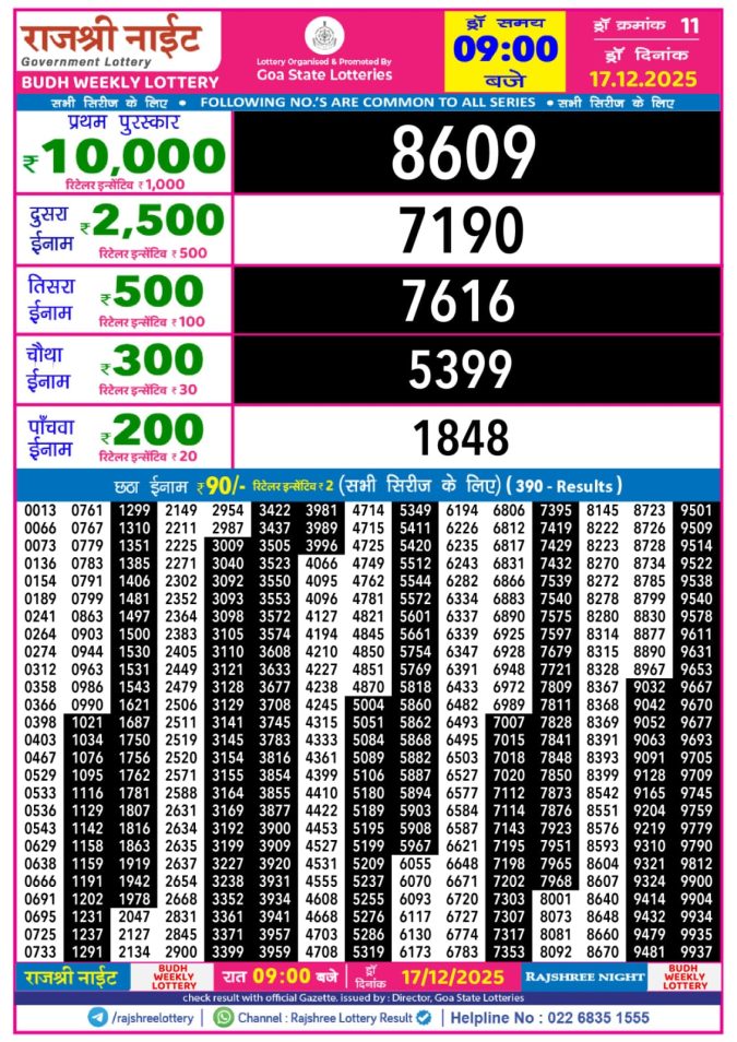 Goa Rajshree 9PM Night Lottery Result Today [17-12-2025]
