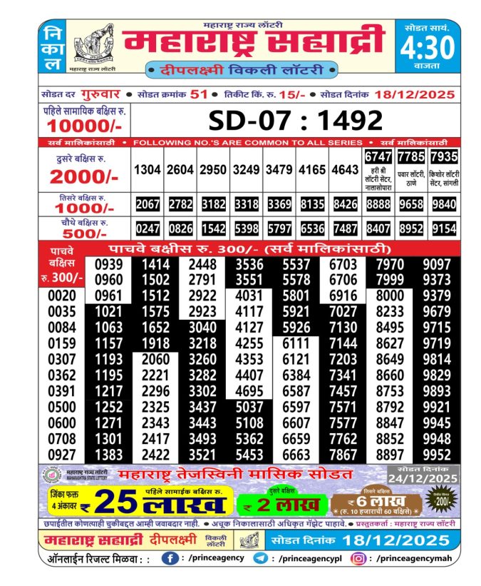 Maharashtra Sahyadri Weekly Lottery Result [18-12-2025]