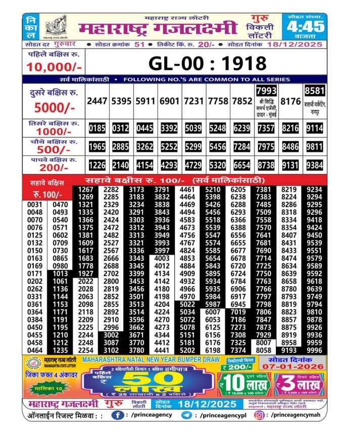 Maharashtra Gajlaxmi Lottery Result [18-12-2025]