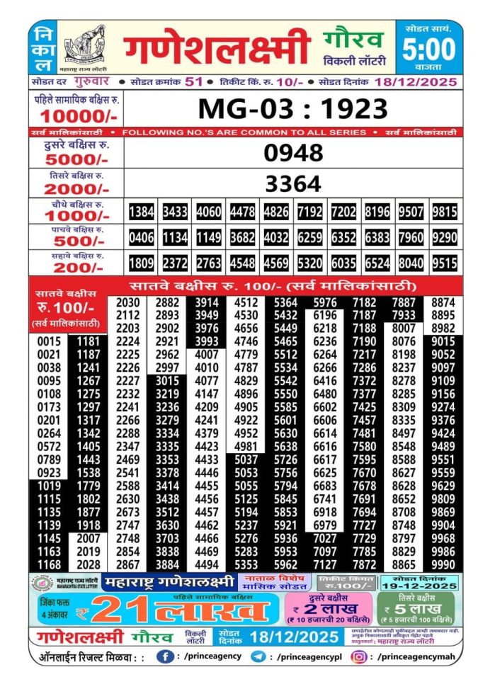 Maharashtra Ganeshlaxmi Lottery Result Today 5PM [18-12-2025]