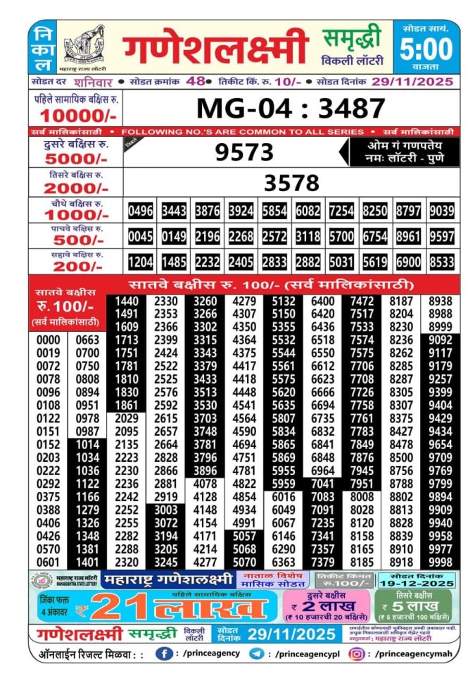 Maharashtra Ganeshlaxmi Lottery Result Today 5PM [29-11-2025]