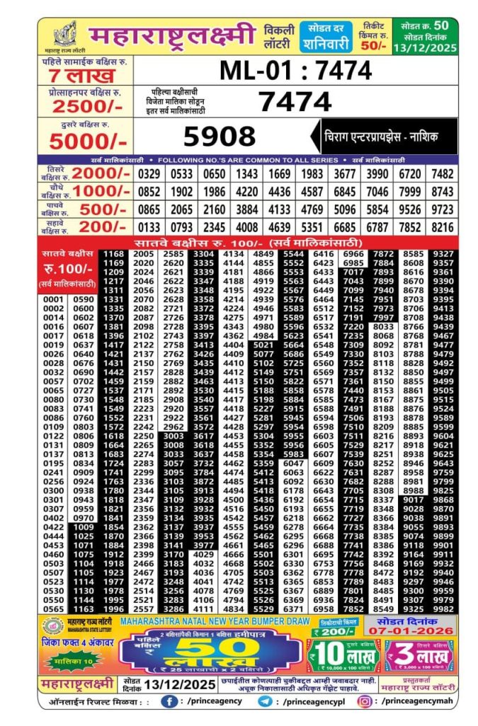 Maharashtra Laxmi Lottery Result Today 4.15PM [13-12-2025]