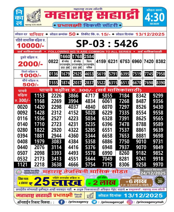 Maharashtra Sahyadri Lottery Result Today 4.30PM [13-12-2025]