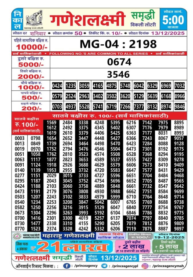 Maharashtra Ganeshlaxmi Lottery Result Today 5PM [13-12-2025]