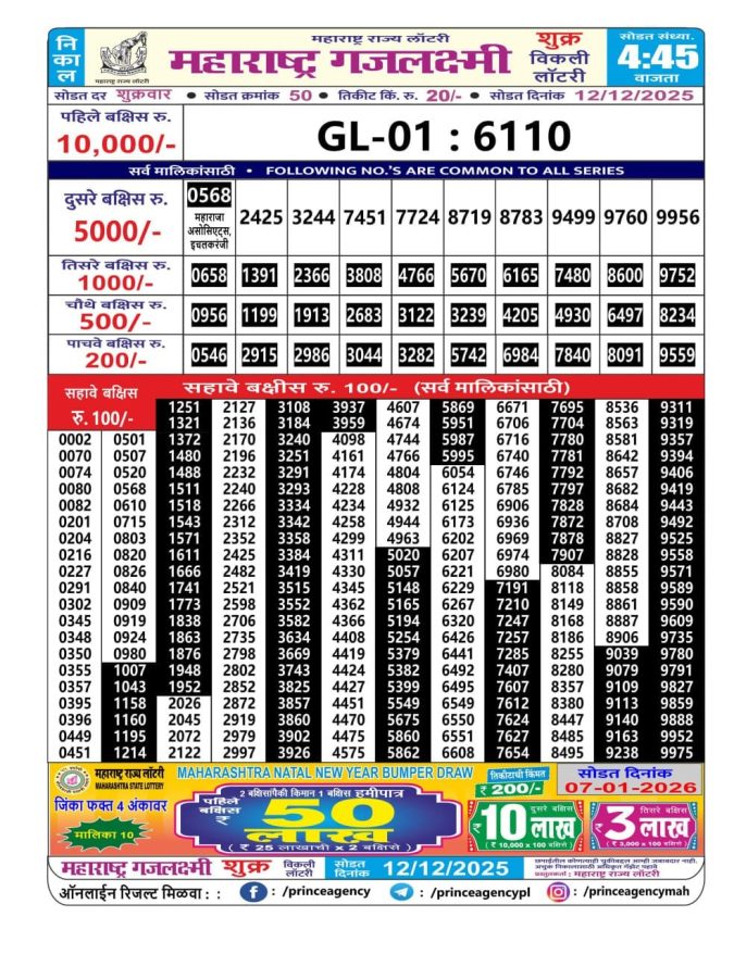 Maharashtra Gajlaxmi Lottery Result Today 4.45PM [12-12-2025]