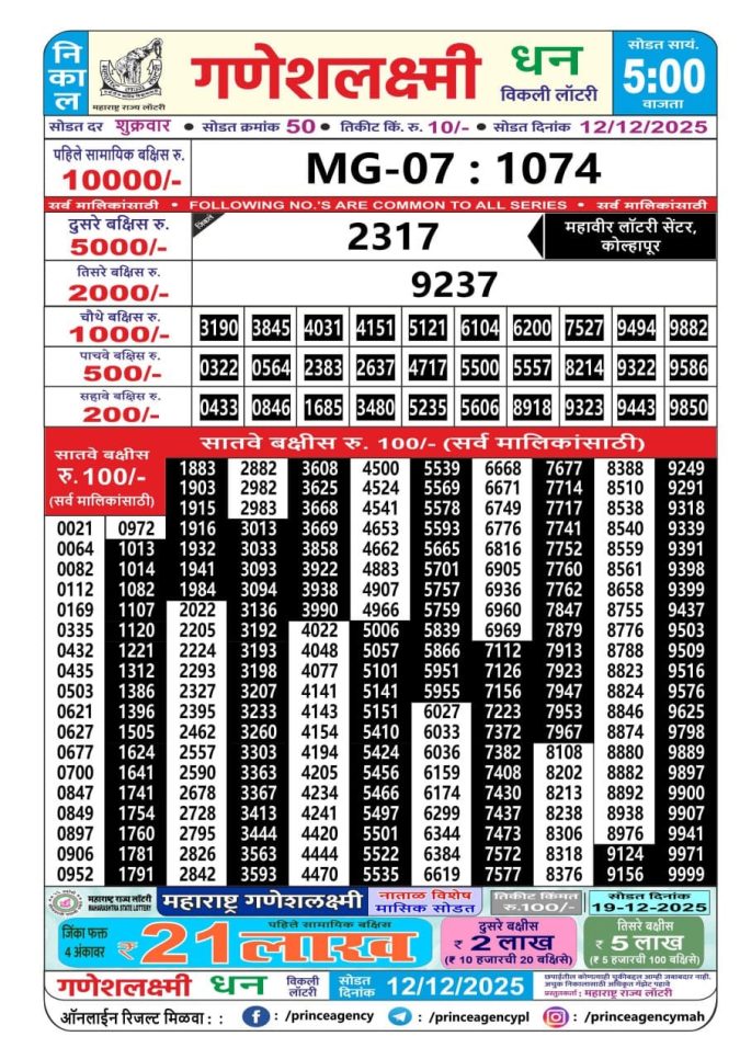 Maharashtra Ganeshlaxmi Lottery Result Today 5PM [12-12-2025]