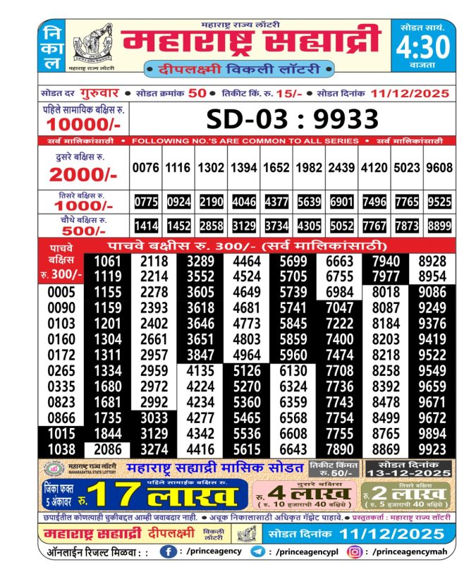 Maharashtra Sahyadri Lottery Result Today 4.30PM [11-12-2025]