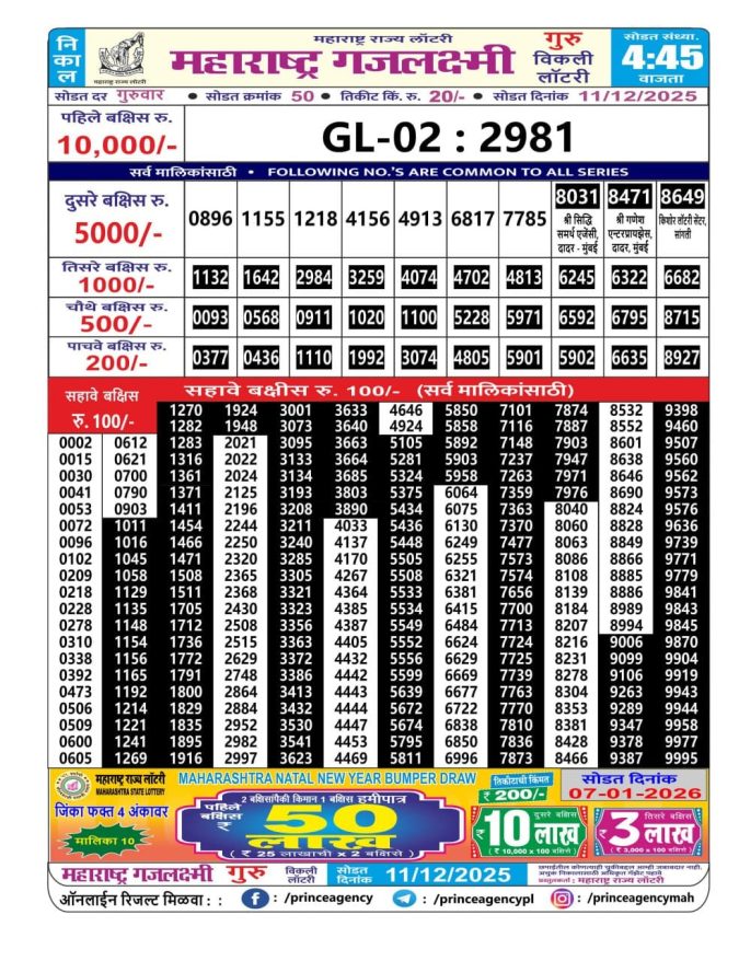 Maharashtra Gajlaxmi Lottery Result Today 4.45PM [11-12-2025]