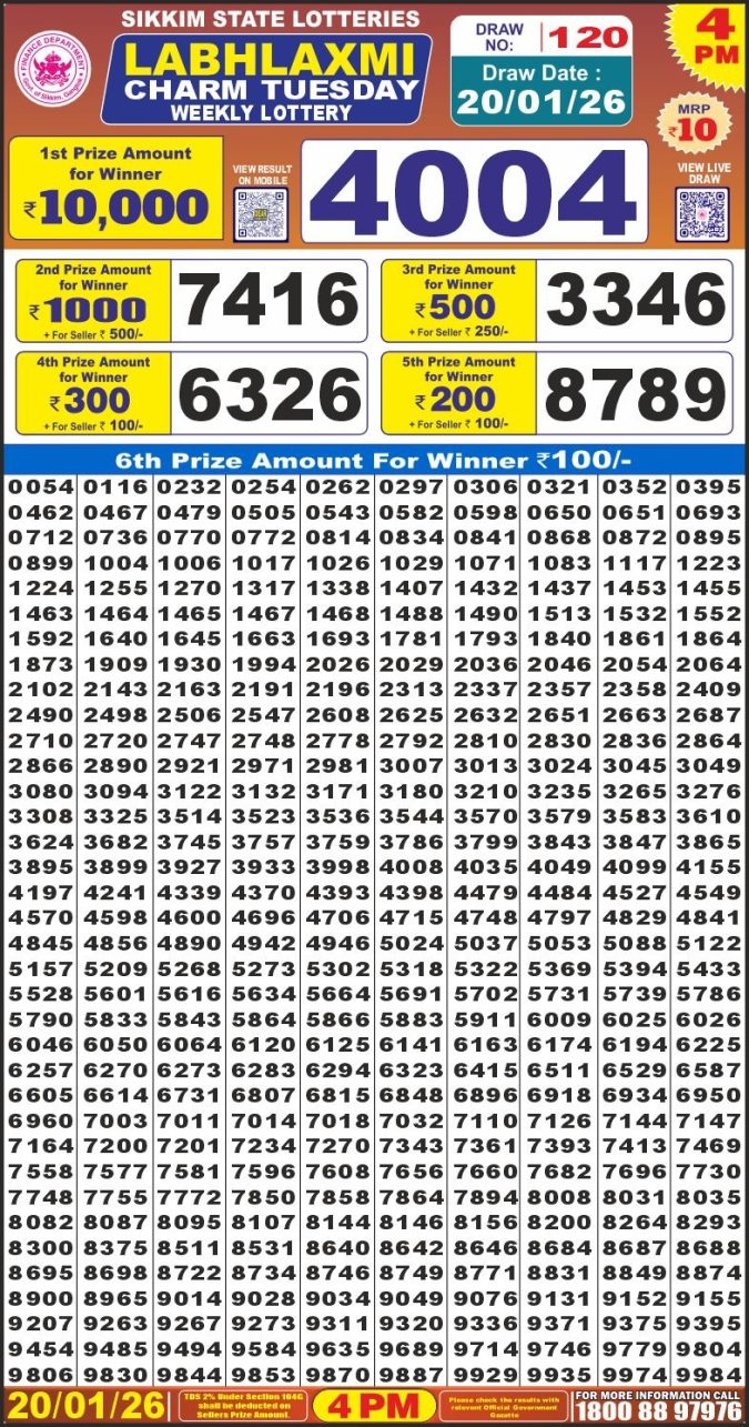 Sikkim Labh Laxmi Lottery Result Today 4PM [20-01-2026]