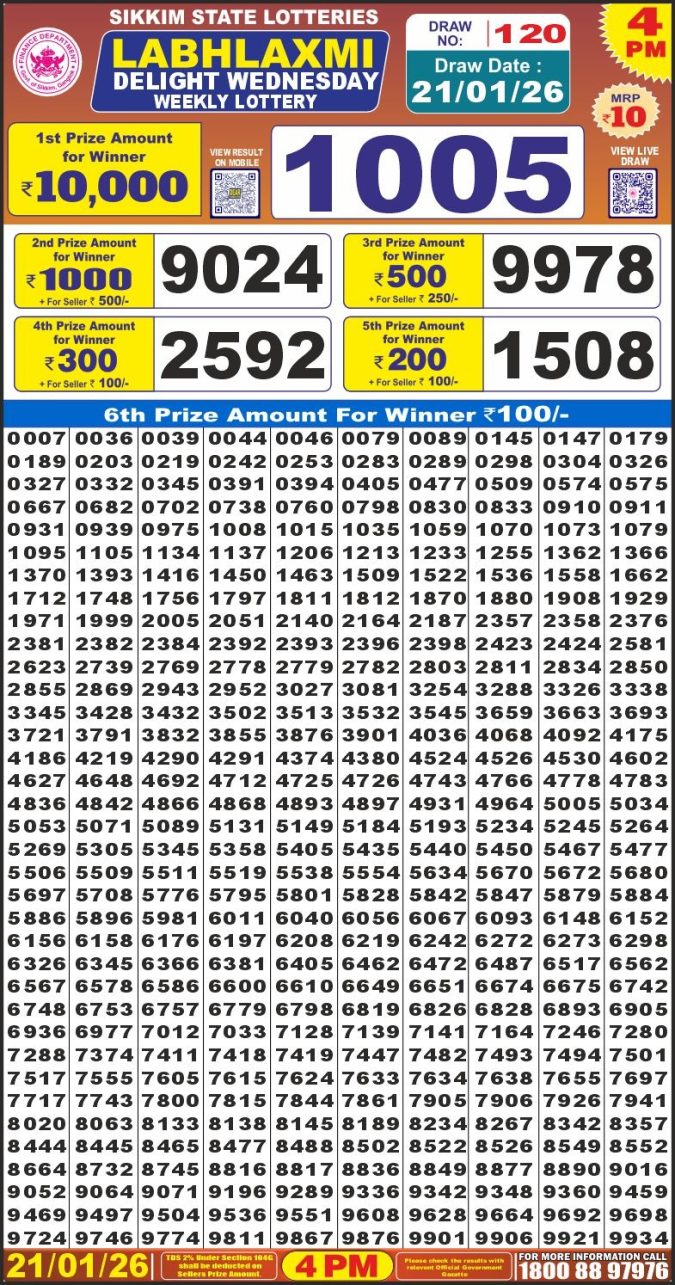 Sikkim Labh Laxmi Lottery Result Today 4PM [21-01-2026]