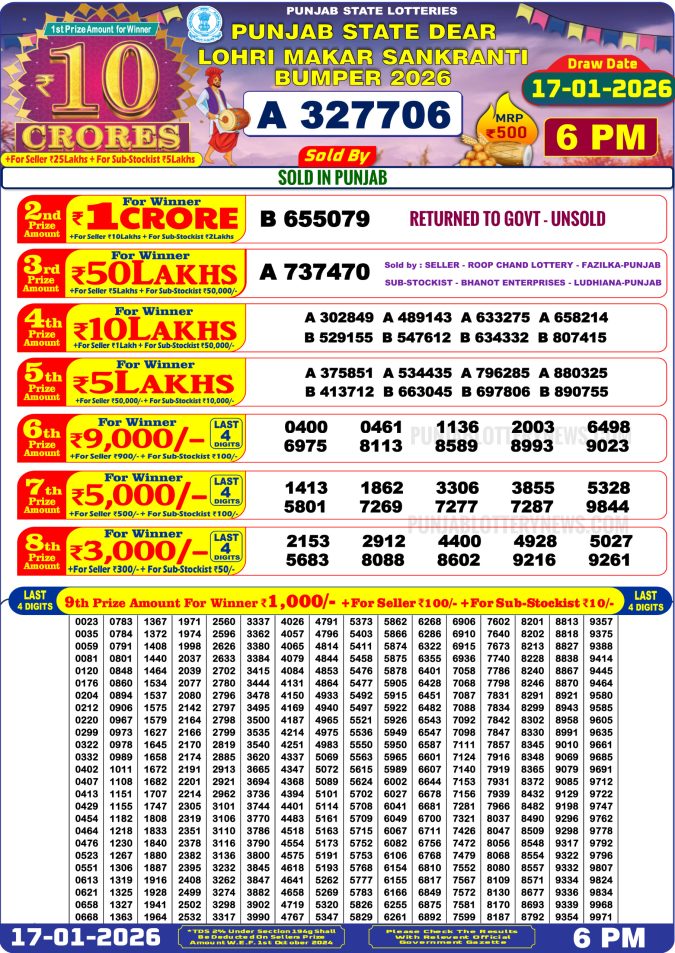Punjab State Lohri Bumper 2026 Result [17-01-2026] Live Now