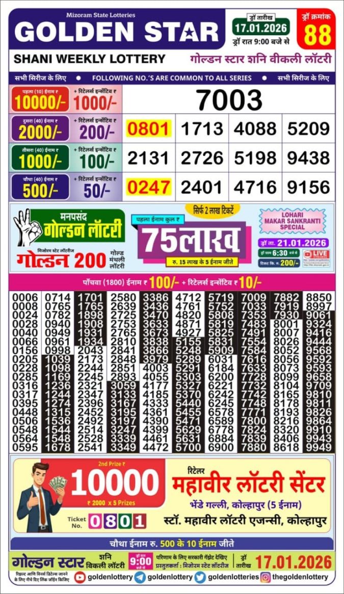 Golden Star Lottery Result Today 9PM [17-01-2026]