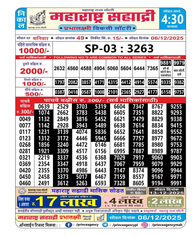 Maharashtra Sahyadri Lottery Result Today 4.30PM [06-12-2025]