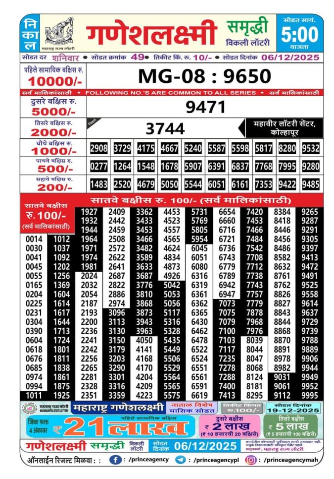 Maharashtra Ganeshlaxmi Lottery Result Today 5PM [06-12-2025]