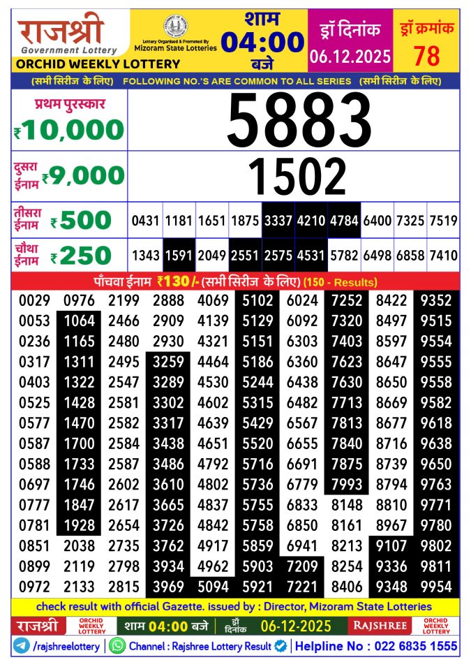 Mizoram Rajshree Lottery Result Today 1PM [06-12-2025]