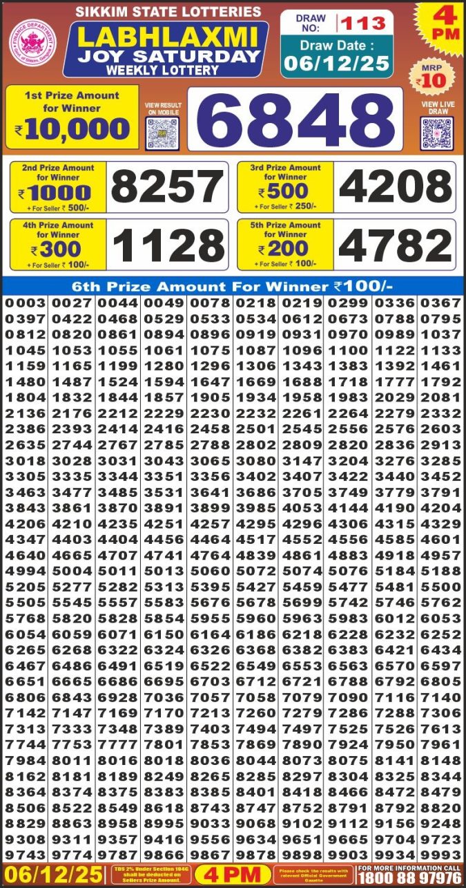 Sikkim Labh Laxmi Lottery Result Today 4PM [06-12-2025]