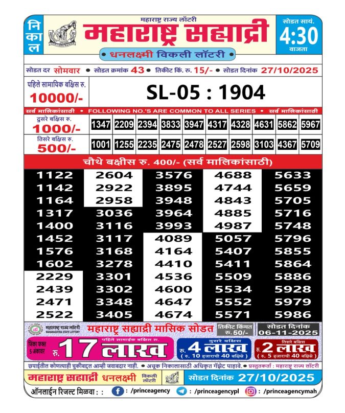 Maharashtra Sahyadri Lottery Result Today 4.30 PM (27-10-2025)