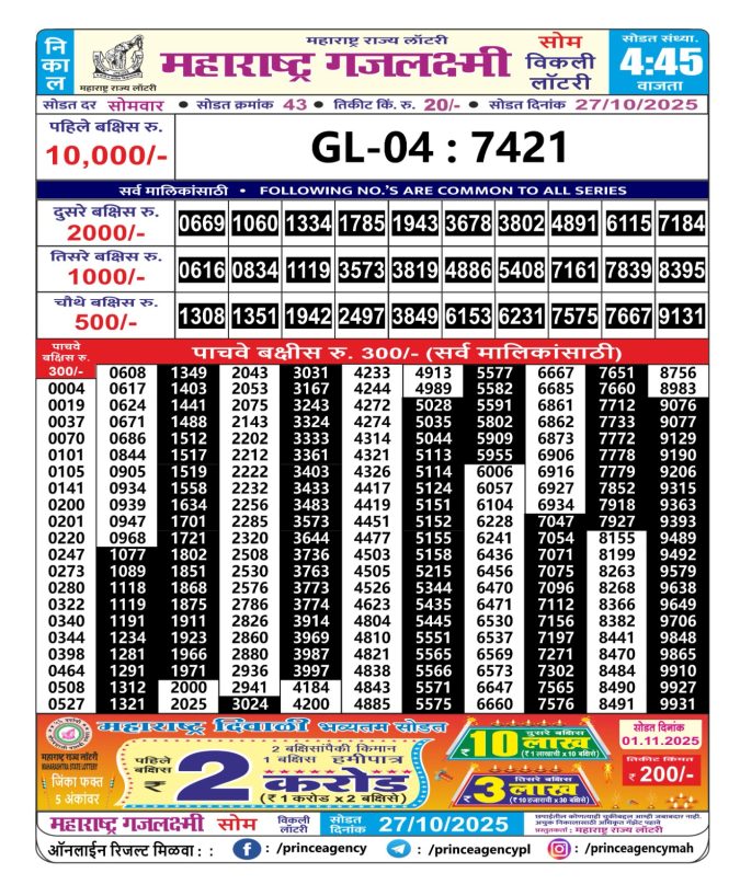 Maharashtra Gajlaxmi Lottery Result Today 4.45 PM (27-10-2025)