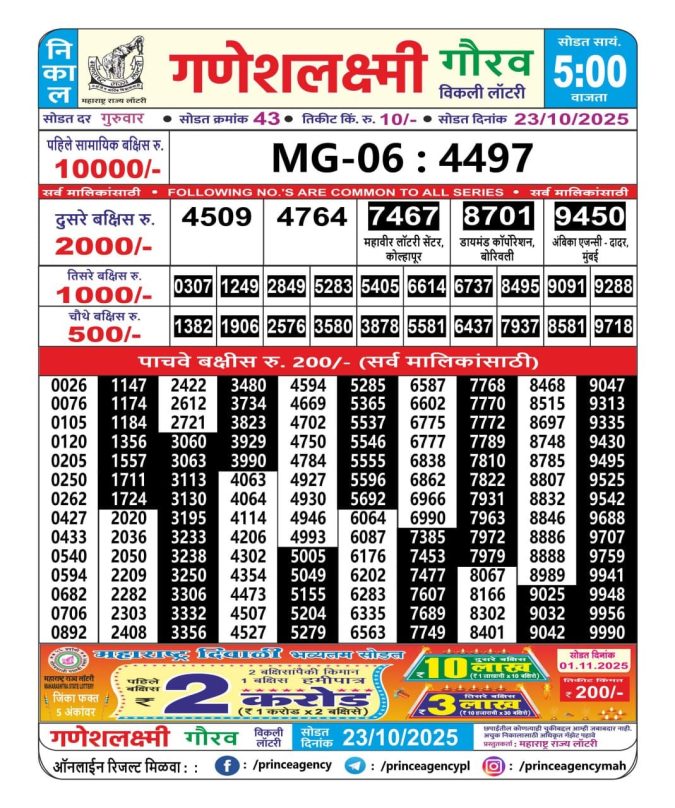 Maharashtra Gajlaxmi Lottery Result Today 4.45 PM (23-10-2025)