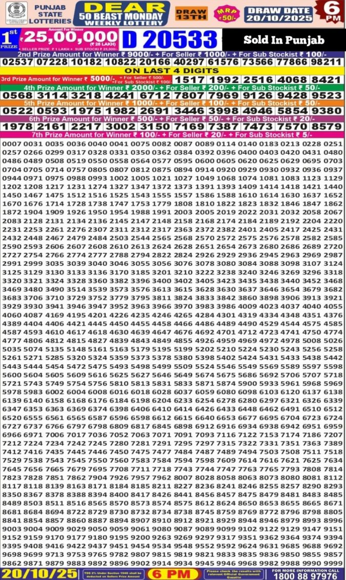 Punjab State Dear 50 Lottery Result Today 6 PM (20-10-2025)