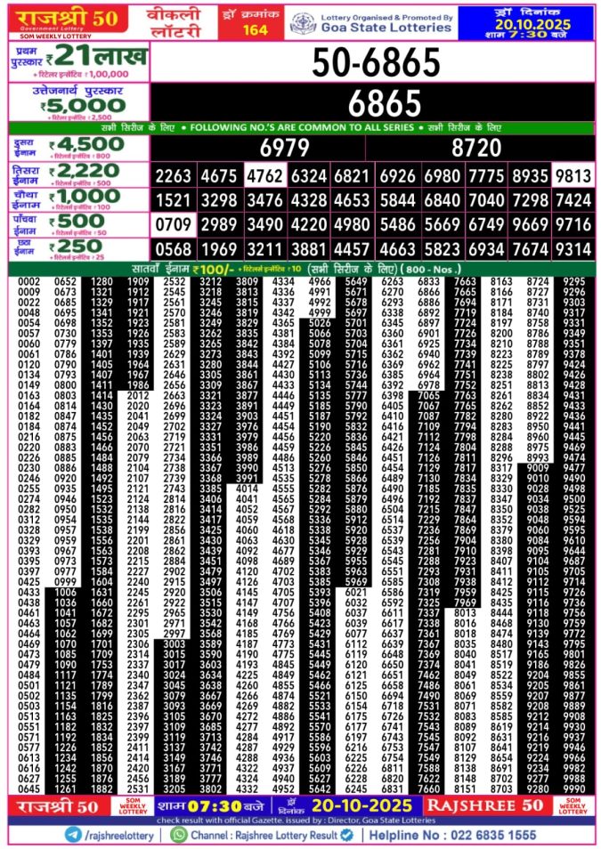 Goa Rajshree 50 Lottery Result Today 7:30 PM (20-10-2025)