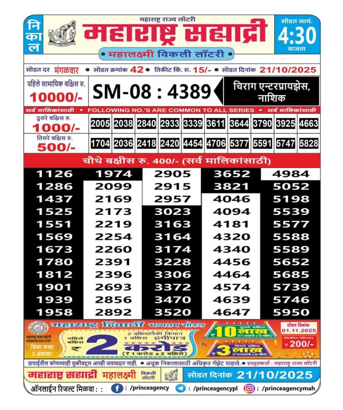 Maharashtra Sahyadri Lottery Result Today 4.30 PM (21-10-2025)