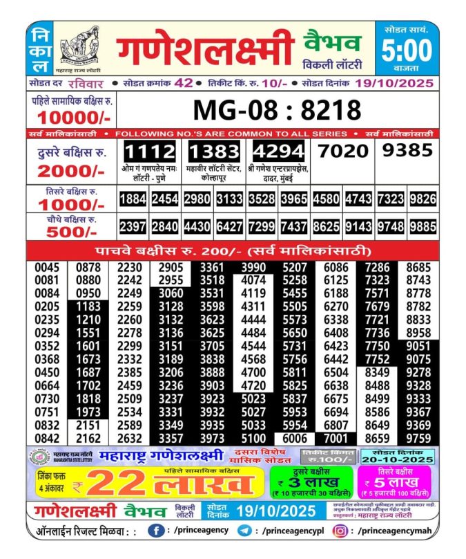 Maharashtra Ganeshlaxmi Lottery Result Today 5 PM (19-10-2025)