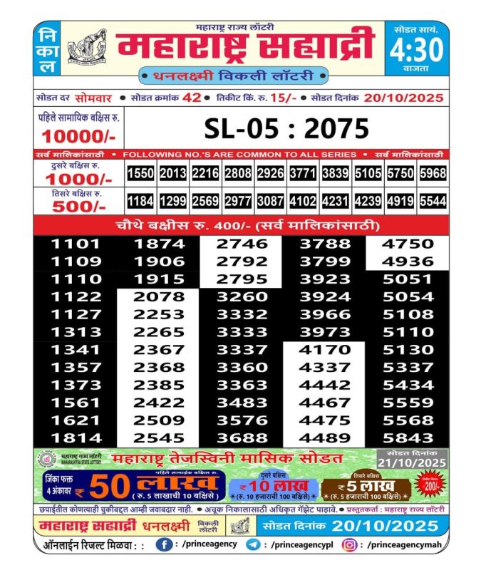 Maharashtra Sahyadri Lottery Result Today 4.30 PM (20-10-2025)