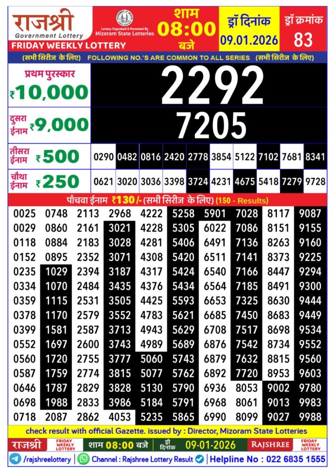 Mizoram Rajshree Lottery Result Today 1PM [09-01-2026]