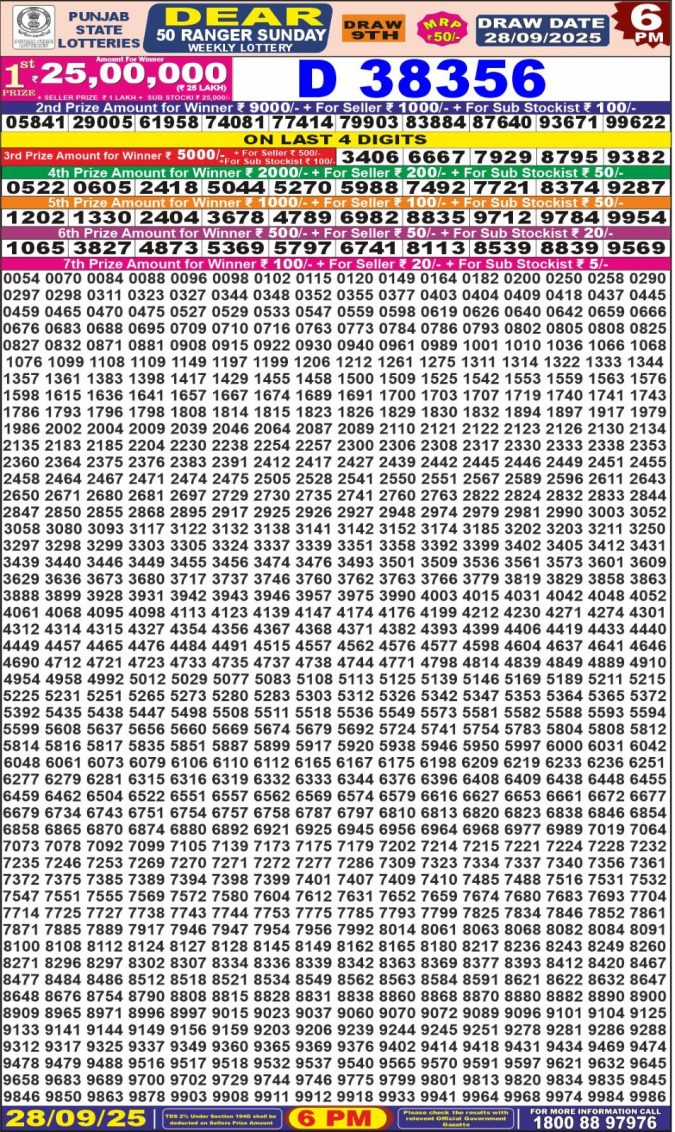 Punjab State Dear 50 Lottery Result Today 6 PM (28-09-2025)