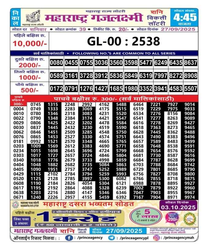 Maharashtra Gajlaxmi Lottery Result Today 4.45 PM (27-09-2025)