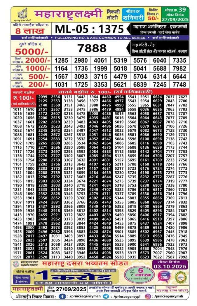 Maharashtra Lottery Result Today 4.15 PM (27-09-2025)