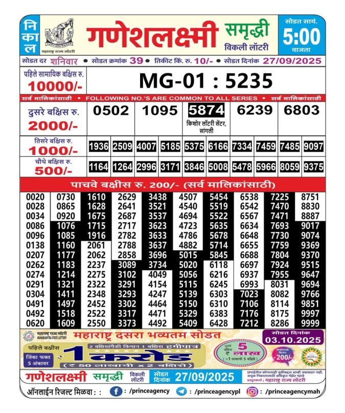 Maharashtra Ganeshlaxmi Lottery Result Today 5 PM (27-09-2025)