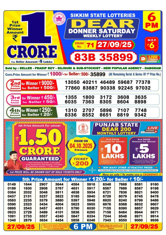 Sikkim Dear Lottery Result Today 6 PM (27-09-2025)