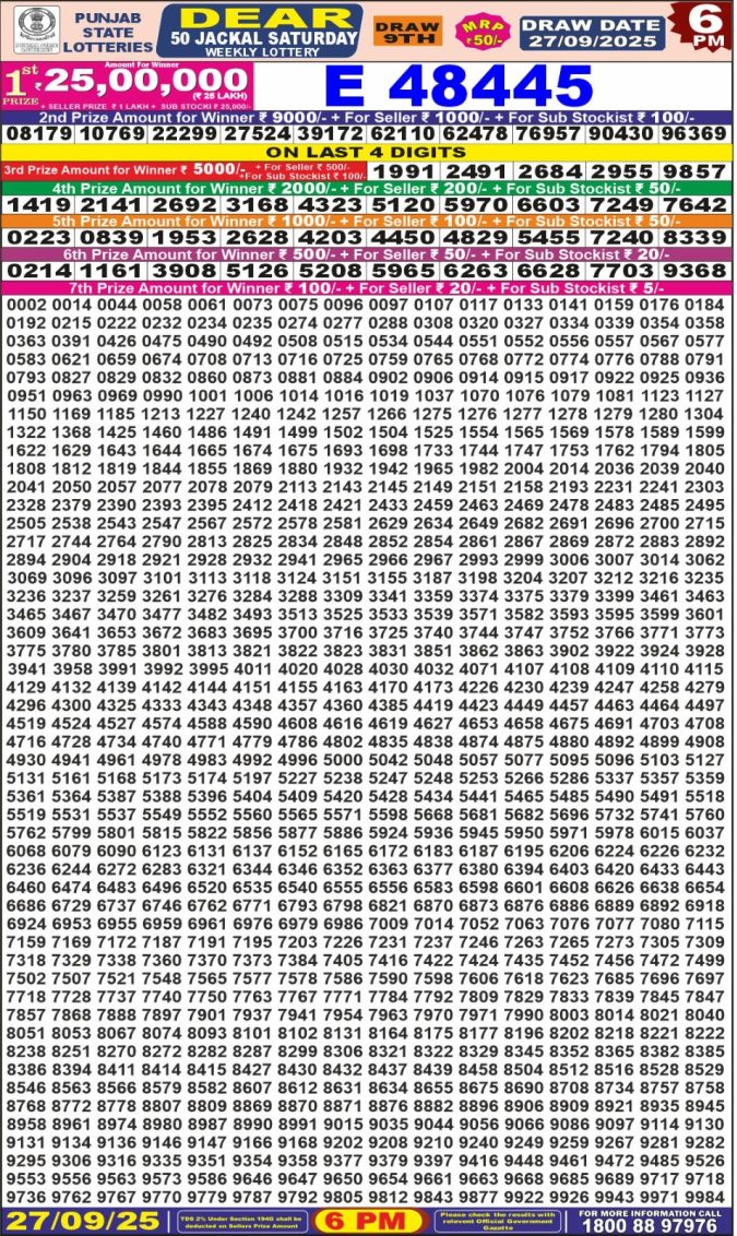 Punjab State Dear 50 Lottery Result Today 6 PM (27-09-2025)