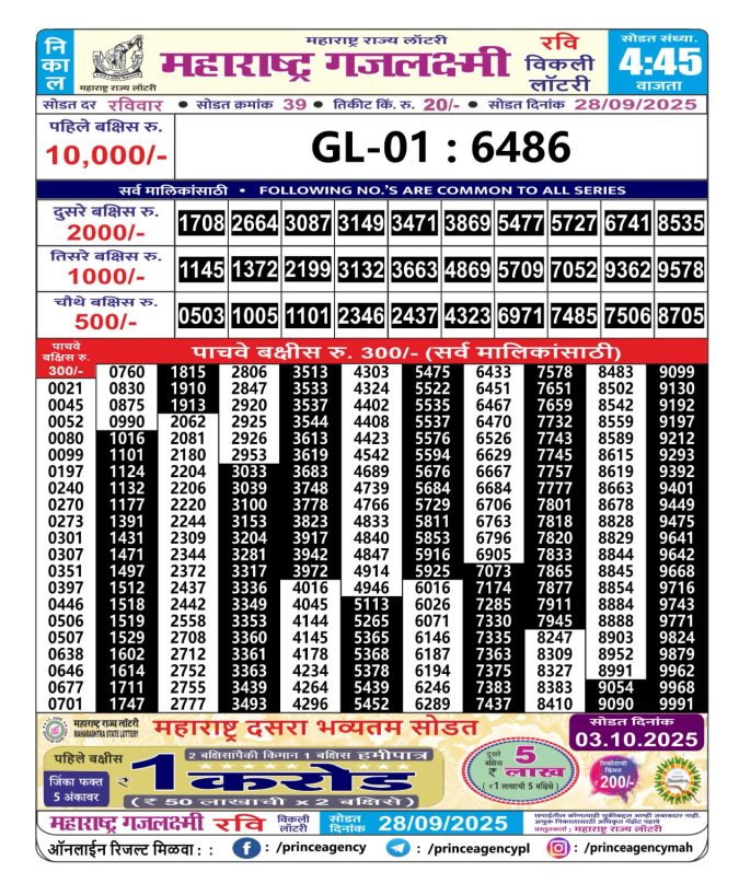 Maharashtra Gajlaxmi Lottery Result Today 4.45 PM (28-09-2025)