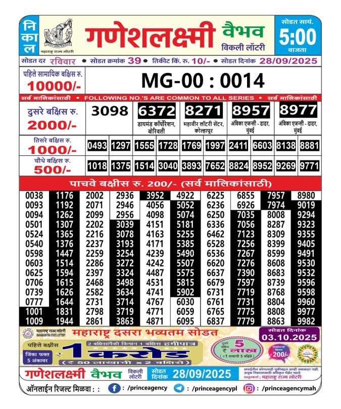 Maharashtra Ganeshlaxmi Lottery Result Today 5 PM (28-09-2025)
