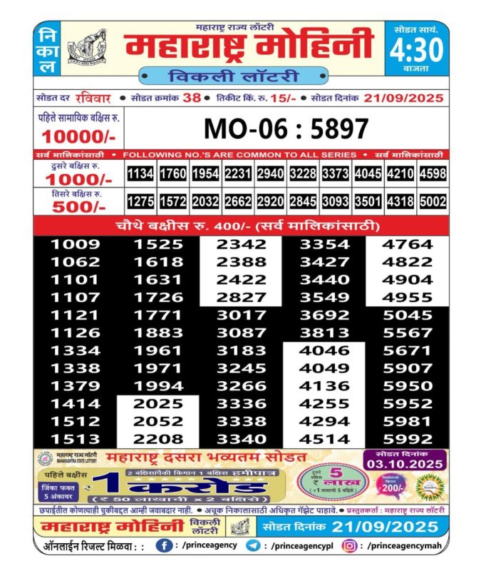 Maharashtra Lottery Result Today 4.15 PM (21-09-2025)