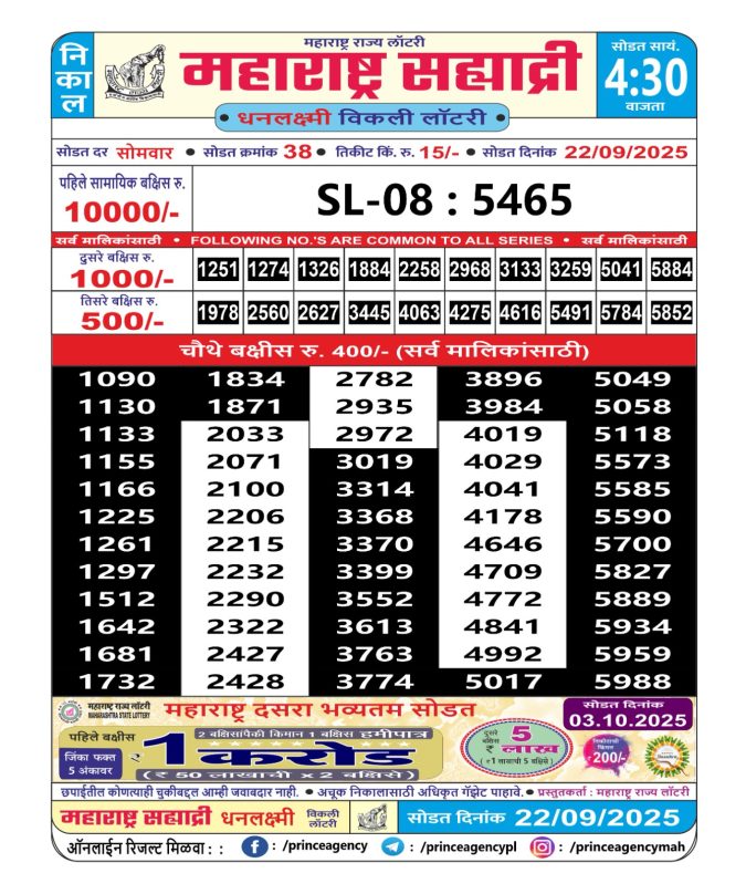 Maharashtra Sahyadri Lottery Result Today 4.30 PM (22-09-2025)