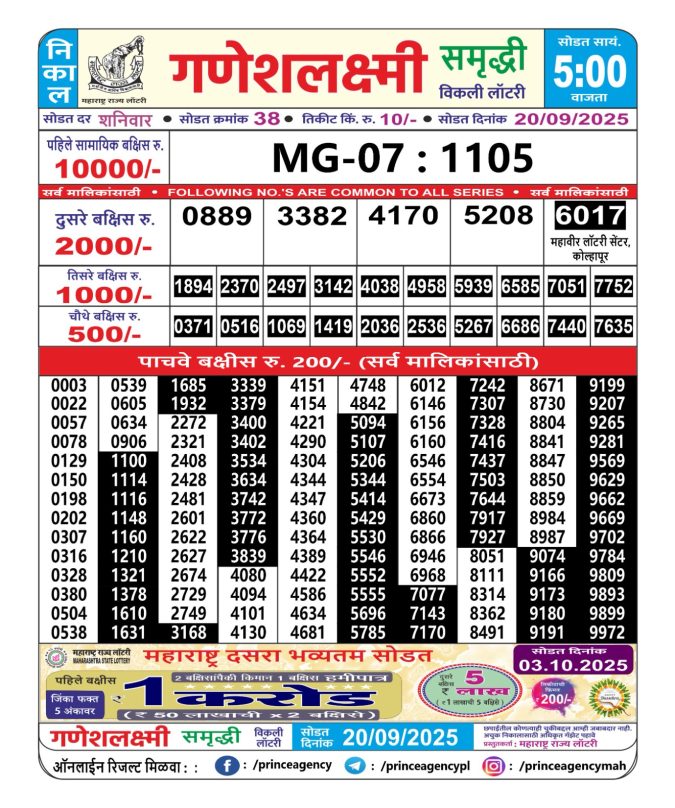 Maharashtra Ganeshlaxmi Lottery Result Today 5 PM (20-09-2025)