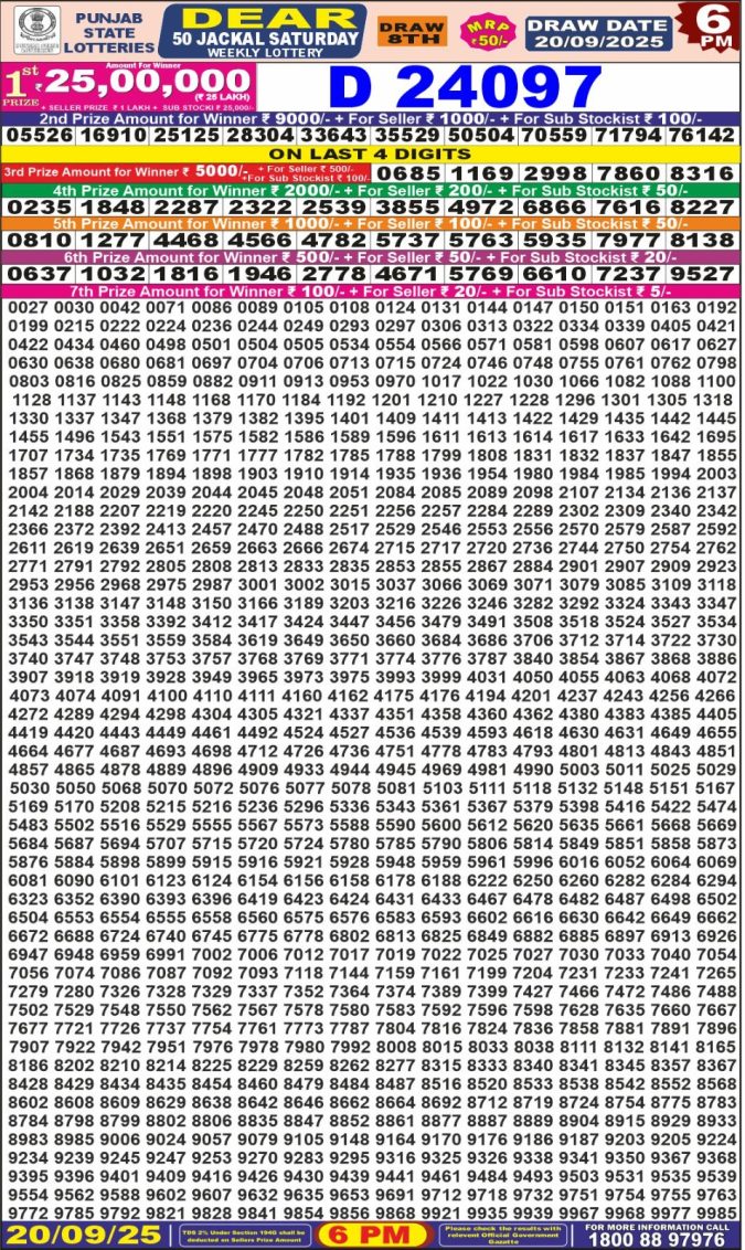 Punjab State Dear 50 Lottery Result Today 6 PM (20-09-2025)
