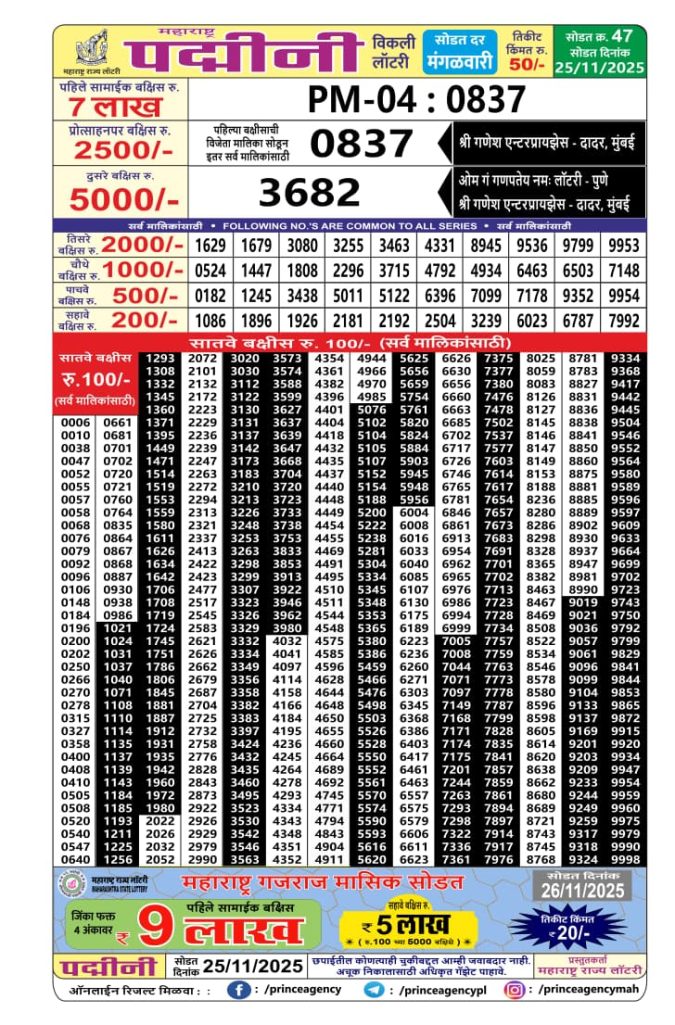 Maharashtra Lottery Result Today Padmini 4.15PM [25-11-2025]