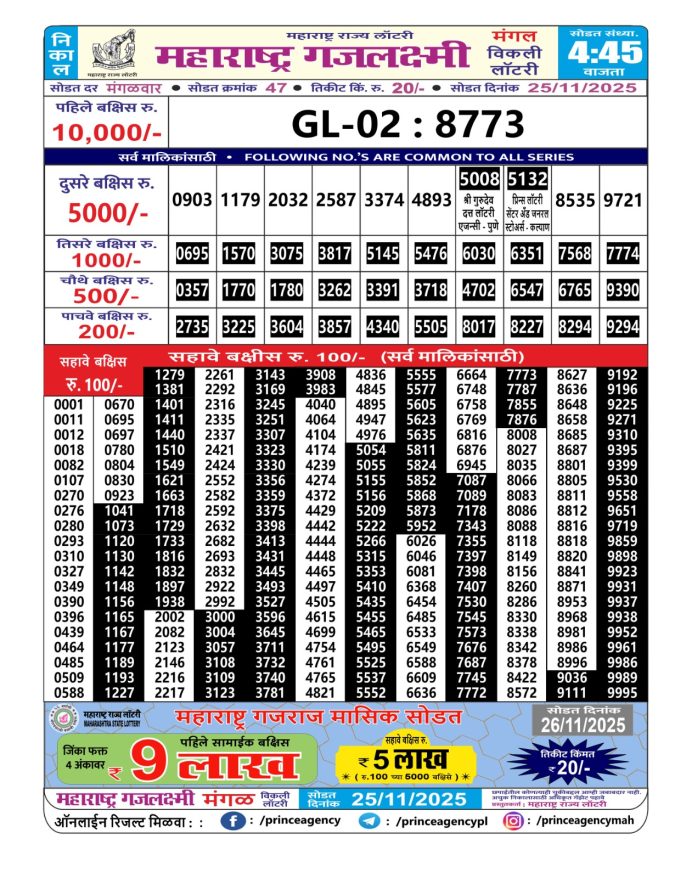 Maharashtra Gajlaxmi Lottery Result Today 4.45PM [25-11-2025]