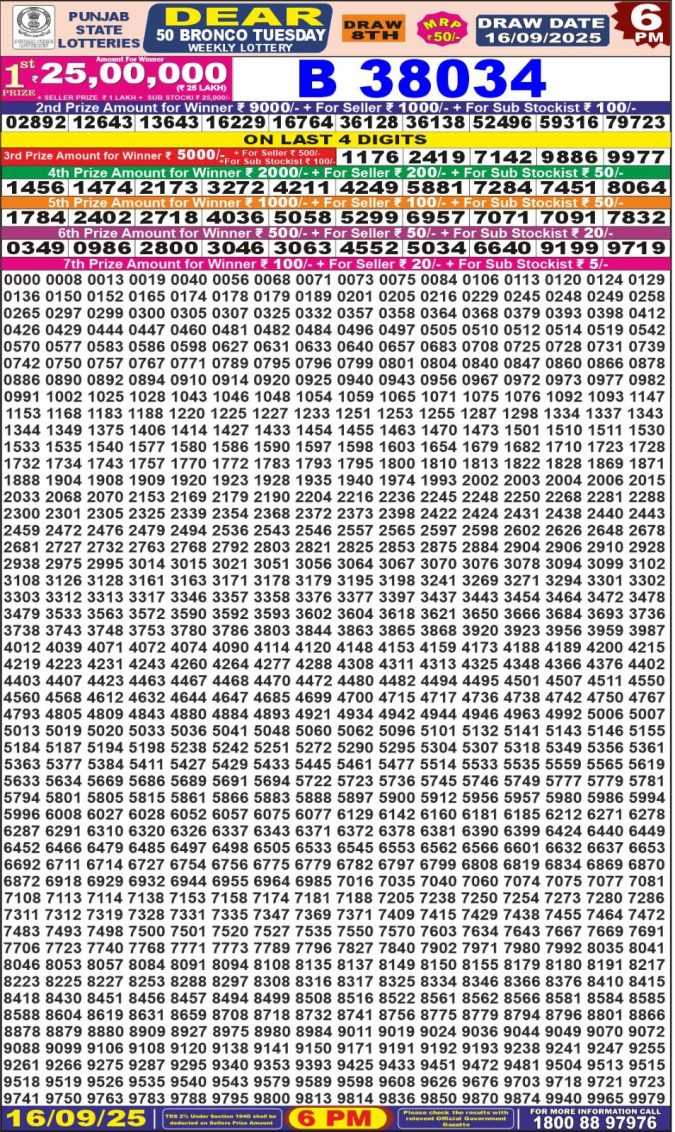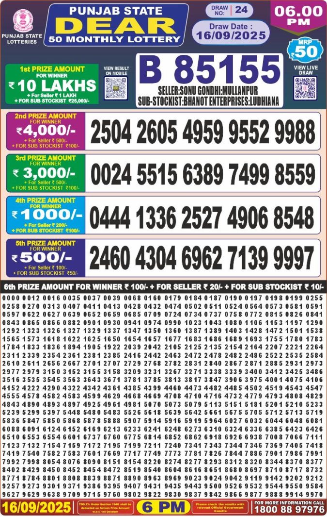 Punjab State Dear 50 Monthly Lottery Result Today 6 PM (16-09-2025)